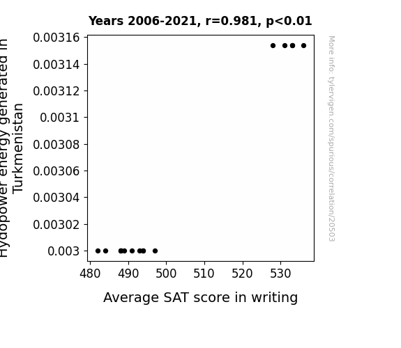 This means 96.3% of the change in the one variable (i.e., Average SAT score in writing) is predictable based on the change in the other (i.e., Hydopower energy generated in Turkmenistan) over the 16 years from 2006 through 2021.