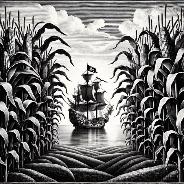 ChatGPT: Generate an image in the style of a black-and-white newspaper illustration portraying a boundless cornfield sprawling over the horizon. In the forefront, rows of towering genetically modified corn plants sway in the wind. In the distance, a pirate ship with a distinct skull and crossbones flag glides across the serene ocean waters, symbolizing the widespread reach of piracy.