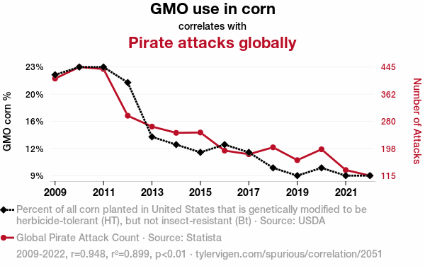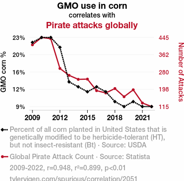 - The spurious research paper: A-Maize-ing Adventures: Exploring the Corny Connection between GMO Use and Global Pirate Attacks
