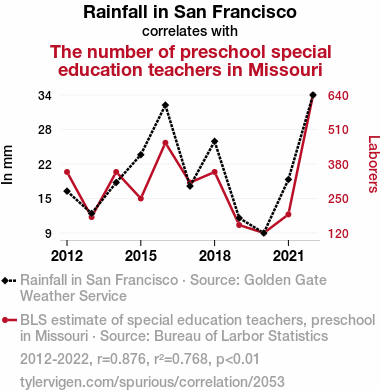 This means 76.8% of the change in the one variable (i.e., The number of preschool special education teachers in Missouri) is predictable based on the change in the other (i.e., Rainfall in San Francisco) over the 11 years from 2012 through 2022.
