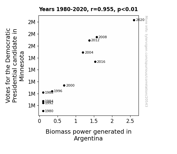 This means 91.2% of the change in the one variable (i.e., Biomass power generated in Argentina) is predictable based on the change in the other (i.e., Votes for the Democratic Presidential candidate in Minnesota) over the 11 years from 1980 through 2020.