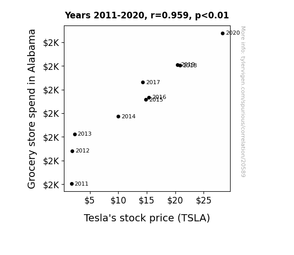 This means 92% of the change in the one variable (i.e., Tesla's stock price (TSLA)) is predictable based on the change in the other (i.e., Grocery store spend in Alabama) over the 10 years from 2011 through 2020.