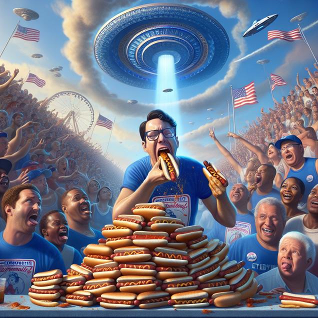 User prompt: Please describe a visual scene that prominently depicts both UFO sightings in Virginia and Hotdogs consumed by Nathan's Hot Dog Eating Competition Champion together. Keep the description simple.