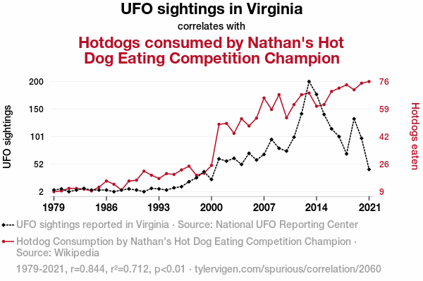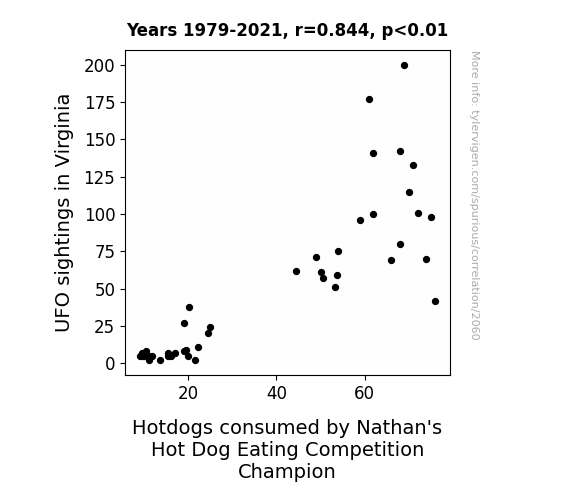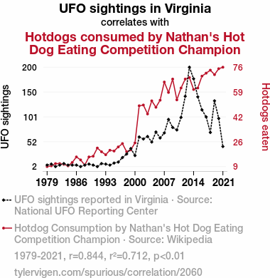 UFO sightings Virginia, Nathan's Hot Dog Eating Competition, correlation between UFO sightings and hotdog consumption, National UFO Reporting Center data, statistical analysis hotdog consumption UFO sightings