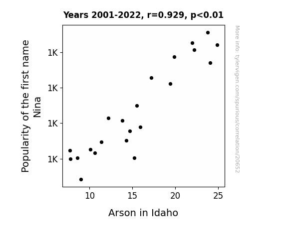 This means 86.3% of the change in the one variable (i.e., Arson in Idaho) is predictable based on the change in the other (i.e., Popularity of the first name Nina) over the 22 years from 2001 through 2022.