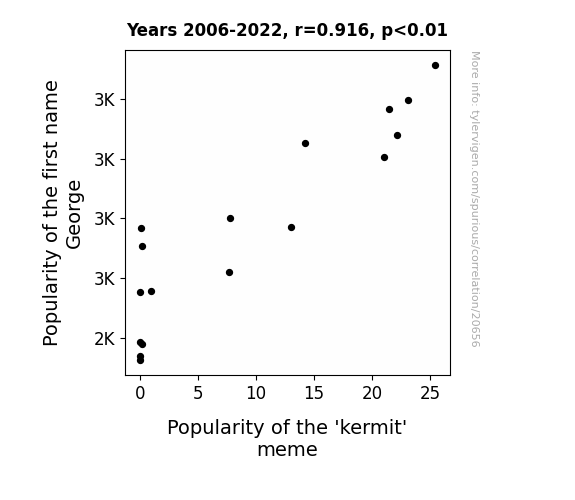 This means 83.9% of the change in the one variable (i.e., Popularity of the 'kermit' meme) is predictable based on the change in the other (i.e., Popularity of the first name George) over the 17 years from 2006 through 2022.