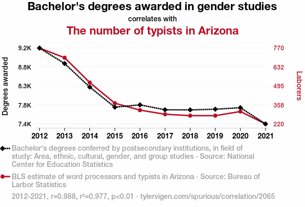 This means 97.7% of the change in the one variable (i.e., The number of typists in Arizona) is predictable based on the change in the other (i.e., Bachelor's degrees awarded in gender studies) over the 10 years from 2012 through 2021.