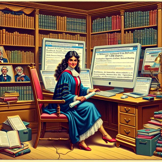 Prompt: Generate an image combining the style of a Discovery magazine cover with the following scene: A bright library setting featuring a confident woman with a Master's degree in Multi/interdisciplinary studies. The woman is proudly holding her diploma while sitting at a computer. The computer screen displays multiple tabs open with articles and forum discussions about the benefits of cold showers. The focus should be on the woman's pride and curiosity as she delves into the topic. The depiction should include only scenes, people, and objects, it should not include text or speech bubbles.