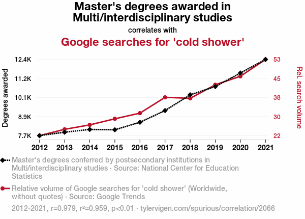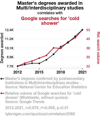 Master's degrees, interdisciplinary studies, Google searches, cold showers, correlation coefficient, statistical significance, National Center for Education Statistics, Google Trends, multidisciplinary academic endeavors, frigid water therapy, mental and physical states