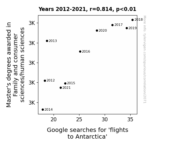 Master's degrees, Family and Consumer Sciences, Human Sciences, academic pursuits, Google searches, flights to Antarctica, correlation, Google Trends, National Center for Education Statistics, wanderlust aspirations, scholarly endeavors, travel destinations
