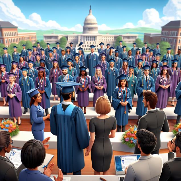User prompt: Please respond with an image generation prompt that would be likely to create an interesting visual using DALLE-3, using the following style: [ 3D Pixar Style ] and depicting this scene: Picture a graduation ceremony at a nursing school in Oregon, where students are receiving their Associate's degrees in Practical Nursing. Among the graduates, you notice several individuals who stand out as they are also CEOs of healthcare organizations in Oregon, wearing their professional attire and mingling with the graduates. Keep the visual depiction simple. Do not include any words or speech bubbles.