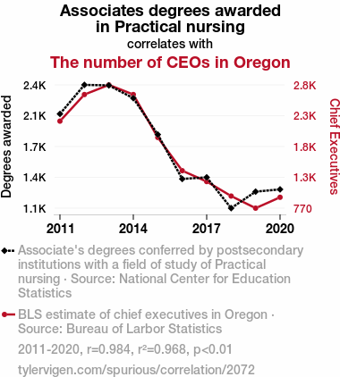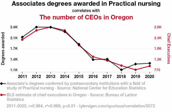 This means 96.8% of the change in the one variable (i.e., The number of CEOs in Oregon) is predictable based on the change in the other (i.e., Associates degrees awarded in Practical nursing) over the 10 years from 2011 through 2020.
