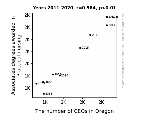 In conclusion, the findings of this study add a touch of whimsy to the often staid world of academic research, demonstrating the improbable yet substantial connection between the issuance of Practical Nursing associate degrees and the population of CEOs in Oregon. The unexpected nature of this relationship prompts a reevaluation of the interconnectedness of seemingly disparate domains, infusing a light-hearted levity into the scrutiny of societal dynamics.