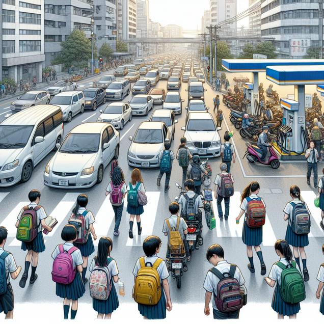 ChatGPT: A busy street in Taiwan, with high school students walking to school carrying backpacks and books. In the background, a line of cars and scooters are filling up at a gas station, representing the petroleum consumption in the country.