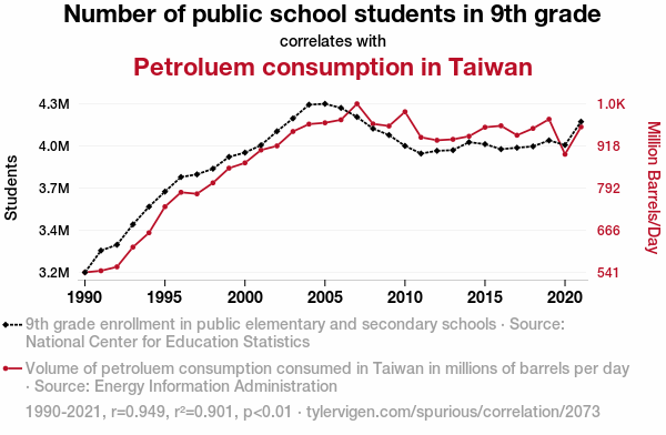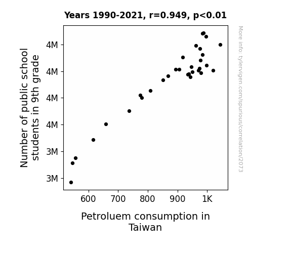 This means 90.1% of the change in the one variable (i.e., Petroluem consumption in Taiwan) is predictable based on the change in the other (i.e., Number of public school students in 9th grade) over the 32 years from 1990 through 2021.