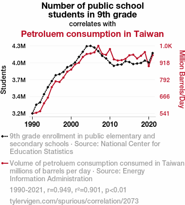 9th grade enrollment, public schools, petroleum consumption, Taiwan, education and energy usage, correlation coefficient, National Center for Education Statistics, Energy Information Administration, factors influencing petroleum consumption
