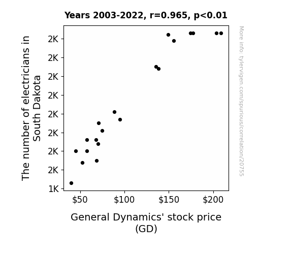 This means 93.2% of the change in the one variable (i.e., General Dynamics' stock price (GD)) is predictable based on the change in the other (i.e., The number of electricians in South Dakota) over the 20 years from 2003 through 2022.