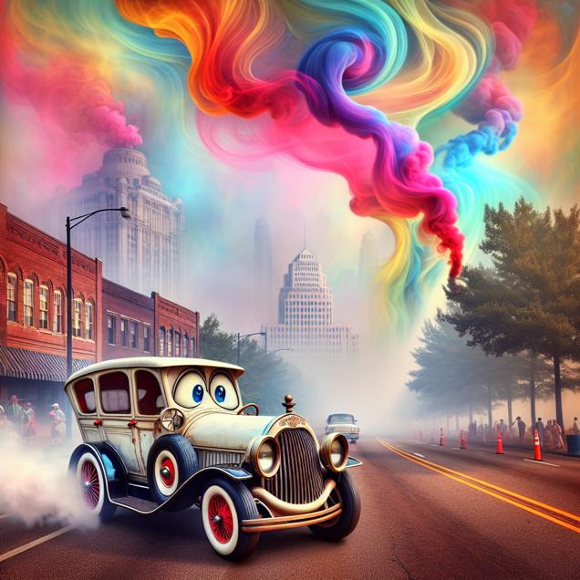 Prompt: Style: Whimsical illustration Scene: In Memphis, the air is filled with a hazy, smoggy quality, making it difficult to see clearly. Filling the air are traces of gasoline fumes, making it evident that cars and vehicles are contributing to the poor air quality. Image Generation Prompt: Generate an image of a charming, vintage car chugging along a smog-filled road in Memphis. The car should have exaggerated features, such as large, expressive headlights and a whimsical, anthropomorphic design. The smog should be depicted as colorful swirls, giving the scene a dreamy, fantastical atmosphere. The overall visual should capture the surreal essence of this polluted yet enchanting environment. The depiction should include only scenes, people, and objects, it should not include text or speech bubbles.