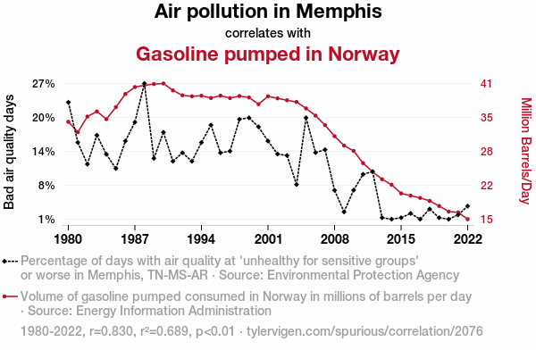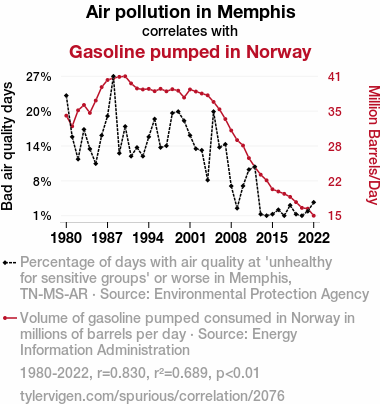 - The spurious research paper: A Breath of Fresh Air or a Tank Full of Trouble: Exploring the Surprising Link Between Unhealthy Air Quality in Memphis and Gasoline Pumped in Norway