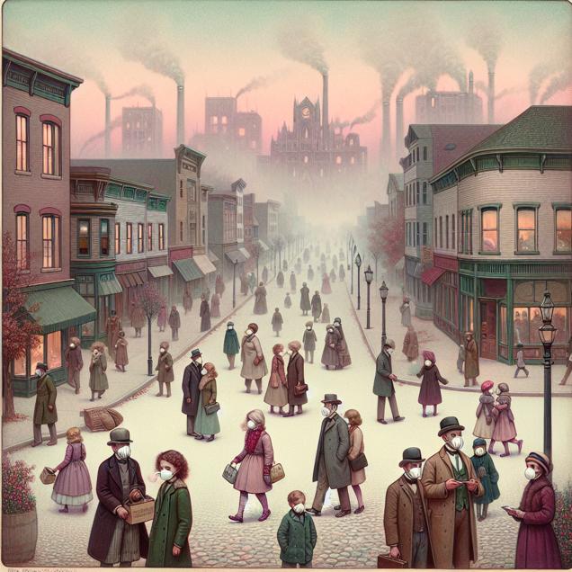 User prompt: Please respond with an image generation prompt that would be likely to create an interesting visual using DALLE-3, using the following style: [ An image that looks like it is a scene from A Disney Movie ] and depicting this scene: A hazy sky looms over Muskogee, Oklahoma as people search on their phones for the latest 'black hole photo' while wearing face masks to shield themselves from the poor air quality. Keep the visual depiction simple. Do not include any words or speech bubbles.