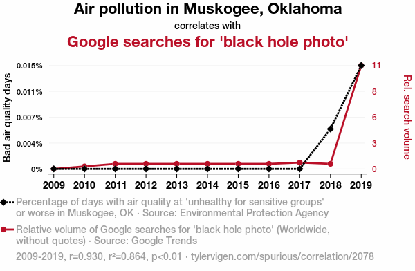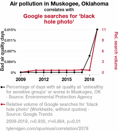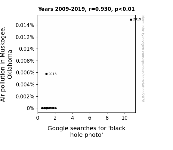 User prompt: Please provide potential search keywords for a paper titled Blending Black Holes: Bizarre Link between Muskogee's Air Pollution and Black Hole Photo Searches with an abstract of Our study delves into the whimsical world of seemingly unrelated phenomena: air pollution in Muskogee, Oklahoma, and public interest in "black hole photo" search queries on Google. While one might think these topics are light years apart, our research reveals a surprising correlation. Leveraging data from the Environmental Protection Agency and Google Trends, our analysis uncovers a eyebrow-raising relationship - a correlation coefficient of 0.9296636 and p < 0.01 from 2009 to 2019. The implications of this correlation are as mind-boggling as a galactic black hole - could the obscurity of Muskogee's air quality be drawing residents to seek out cosmic escapes? Or is there an otherworldly force influencing both phenomena? This unexpected connection certainly leaves us with more questions than answers, but one thing's for sure: researching the cosmic and the pollutant on Earth has been an oddly enlightening adventure.