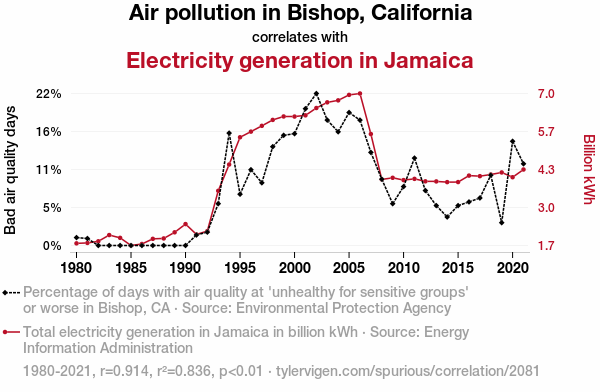 - The spurious research paper: Smoke Signals: The Shocking Relationship Between Air Pollution in Bishop, California and Electricity Generation in Jamaica