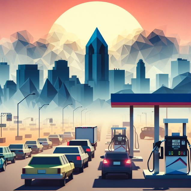 ChatGPT: Generate an image depicting a low poly style city skyline of Albuquerque with a hazy, polluted atmosphere. In the foreground, include a simplified representation of a gasoline pump in Guam, surrounded by cars lining up to refuel. The visual should convey the contrast between urban pollution and the necessity for fuel in a simple, yet impactful manner.