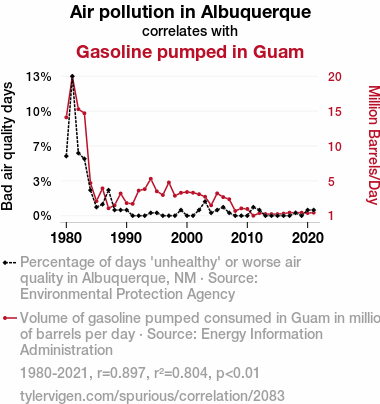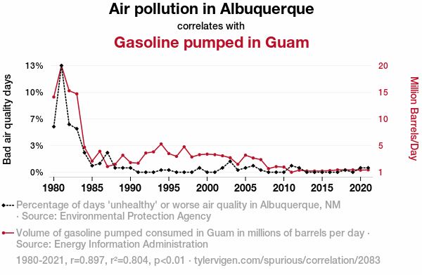 A linear line chart with years as the X-axis and two variables on the Y-axis. The first variable is Air pollution in Albuquerque and the second variable is Gasoline pumped in Guam.  The chart goes from 1980 to 2021, and the two variables track closely in value over that time. Small Image