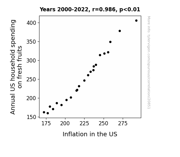 This means 97.2% of the change in the one variable (i.e., Inflation in the US) is predictable based on the change in the other (i.e., Annual US household spending on fresh fruits) over the 23 years from 2000 through 2022.