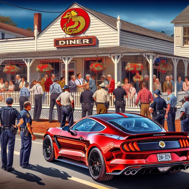 Prompt: [ Concept art ] Create an image of a vibrant street scene in a bustling South Carolina town. A sleek red sports car with "Asia" emblazoned on its side is parked in front of a classic diner, with the attention of onlookers drawn to its striking presence. Meanwhile, a group of vigilant police officers are shown investigating a recent motor vehicle theft, maintaining a close watch on the area. Capture the contrast between the admiration for the car and the tense atmosphere surrounding the investigation. The depiction should include only scenes, people, and objects, it should not include text or speech bubbles.
