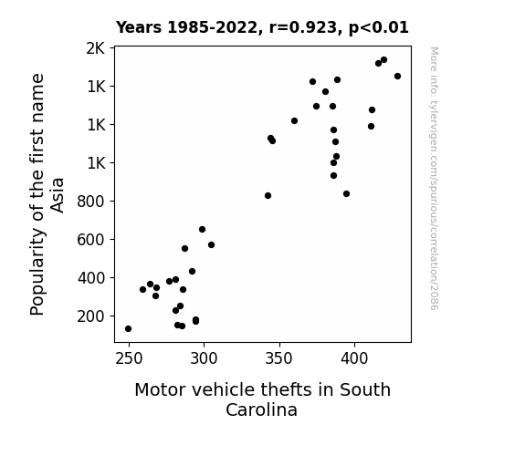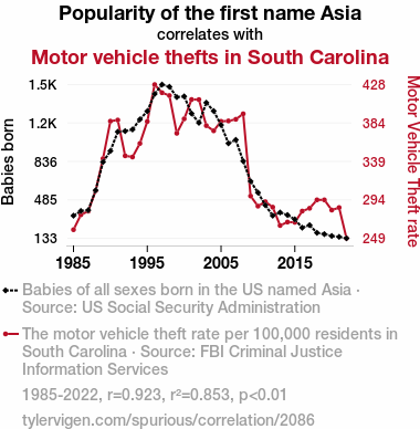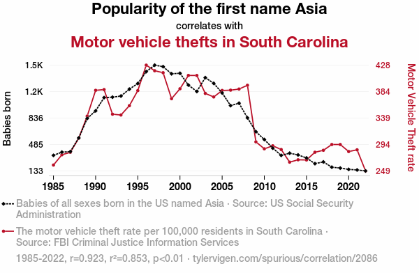 - The spurious research paper: Can't 'Asia' the Connection: Exploring the Correlation Between the Popularity of the Name 'Asia' and Motor Vehicle Thefts in South Carolina