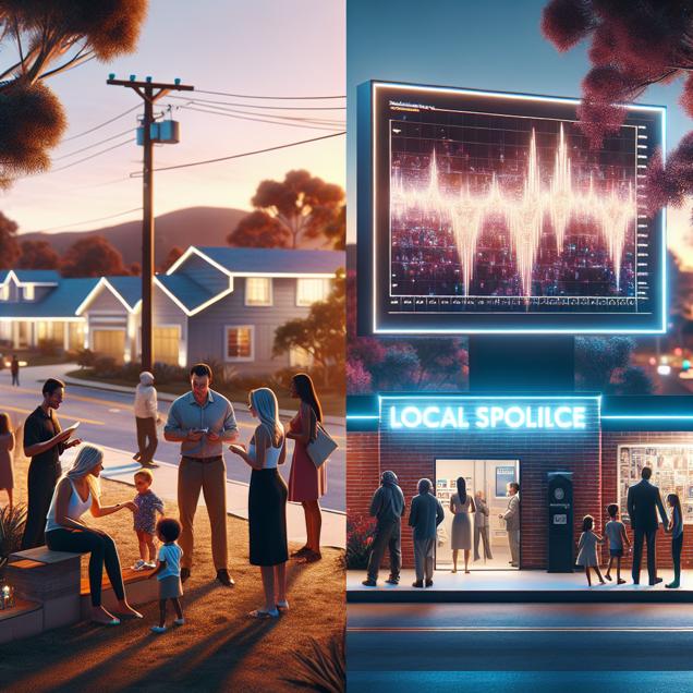 Prompt: Generate an image showing a quiet, suburban neighborhood in South Carolina. A group of parents is gathered in conversation. A sleek, futuristic billboard prominently displays the decline of the name "William" over the years, with a modern and dynamic visual representation. Nearby, the local police station features a high-tech graph depicting a significant decrease in burglaries in the area. The visuals should convey a sense of high-tech sophistication and modernity, evoking the peaceful atmosphere of the neighborhood amidst the thought-provoking discussion about baby names and societal changes. The scene should highlight the correlation between the decline in popularity of the name "William" and the decrease in criminal activities, bringing the high-tech elements into the peaceful setting. The depiction should include only scenes, people, and objects, it should not include text or speech bubbles.
