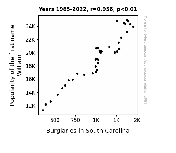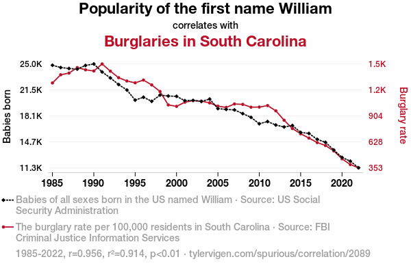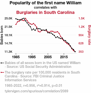 - The spurious research paper: Will-i-Am's Effect: Analyzing the Correlation Between the Popularity of the Name William and Burglary Rates in South Carolina