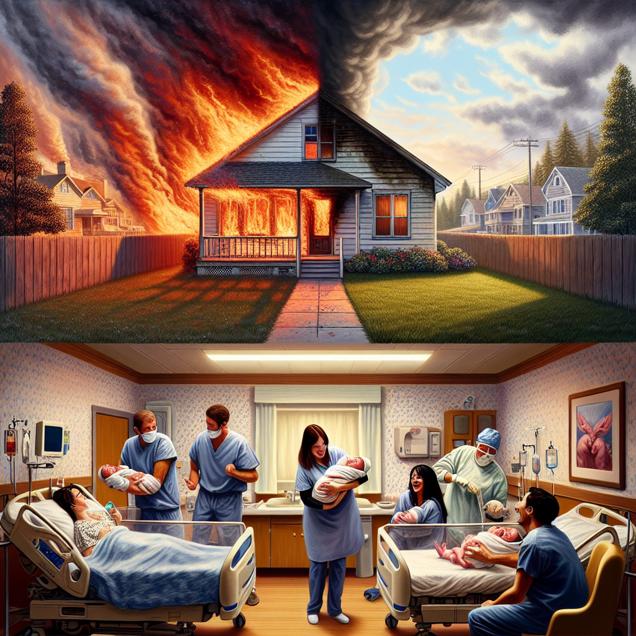 ChatGPT: Create an image of contrasts between chaos and peace in a suburban setting. Show a serene neighborhood in Delaware with a small house engulfed in flames, billowing out smoke from the windows. Meanwhile, at the local hospital, depict three sets of triplets being born simultaneously, bringing unexpected joy and a flurry of newborns into the world. The juxtaposition of these scenes should emphasize the stark contrast between the calamity and celebration in a peaceful environment. The focus should be on the emotions stirred by these opposing events.