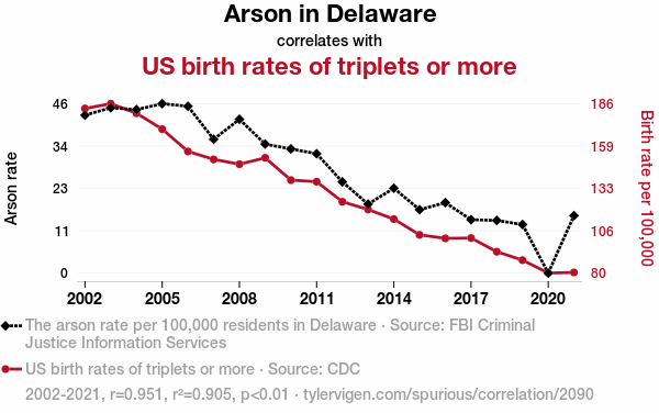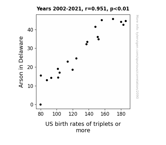 - The spurious research paper: Playing with Fire: Exploring the Incendiary Connection Between Arson Rates in Delaware and the Uncommon Incidence of Triplet Births in the United States