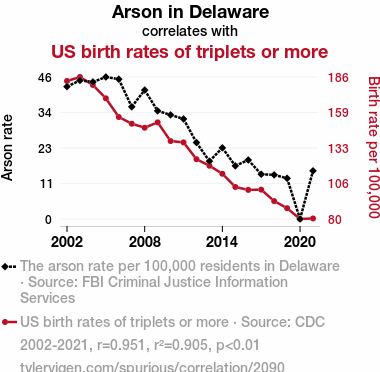 arson rates, Delaware, triplet births, United States, crime statistics, birth rates, statistical correlation, FBI Criminal Justice Information Services, Centers for Disease Control and Prevention, criminology, reproductive demography