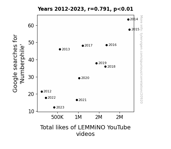 This means 62.6% of the change in the one variable (i.e., Total likes of LEMMiNO YouTube videos) is predictable based on the change in the other (i.e., Google searches for 'Numberphile') over the 12 years from 2012 through 2023.