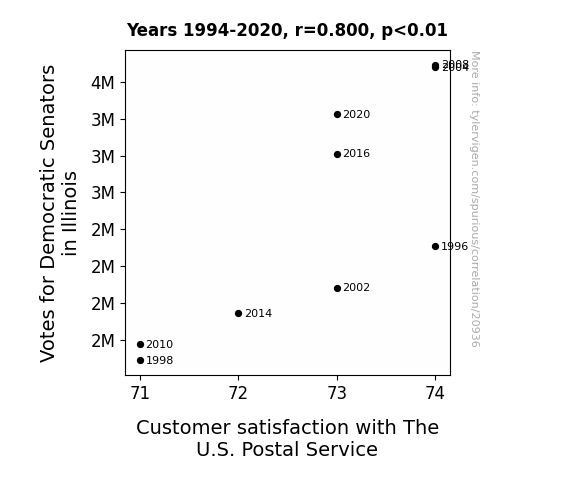 This means 64% of the change in the one variable (i.e., Customer satisfaction with The U.S. Postal Service) is predictable based on the change in the other (i.e., Votes for Democratic Senators in Illinois) over the 9 years from 1994 through 2020.