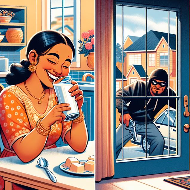 ChatGPT: Generate a cozy and whimsical illustration of a person savoring a glass of milk at a quaint kitchen table. The individual should emanate a sense of contentment as they engage in this simple pleasure. Meanwhile, outside the window, depict a mischievous thief attempting to break into a car parked in the driveway. The contrasting scenes of serenity and potential danger should be captured in a charming and playful art style to create an intriguing visual narrative.