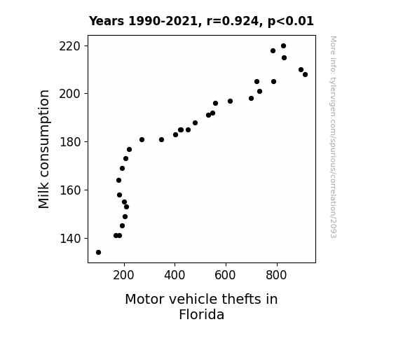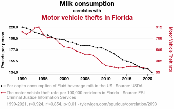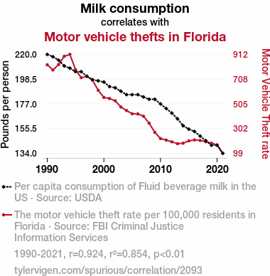 - The spurious research paper: The Milky Whey: Investigating the Correlation Between Milk Consumption and Motor Vehicle Thefts in Florida