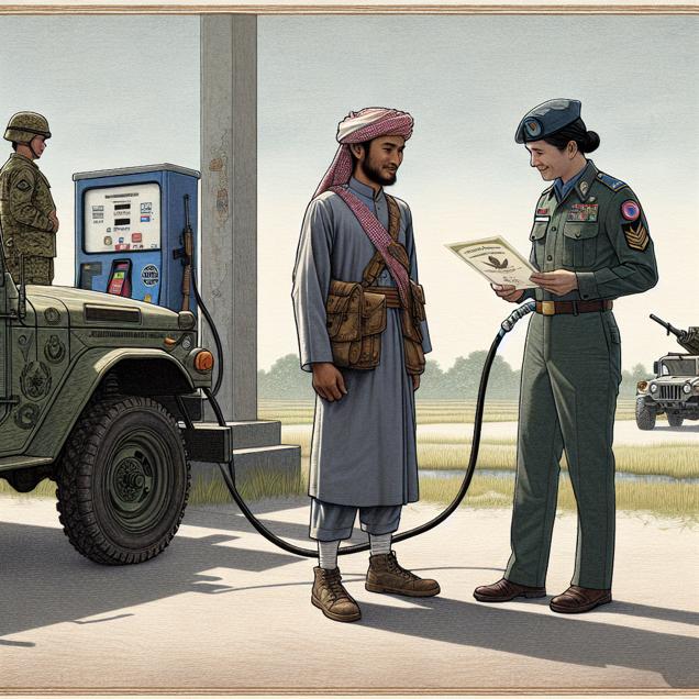 ChatGPT: In the outskirts of a military base in Laos, a soldier in uniform is being handed an Associate's degree certificate in Military Technologies and Applied Sciences. Nearby, a gas station attendant finishes pumping gasoline into a military vehicle as it is being prepared for a mission.