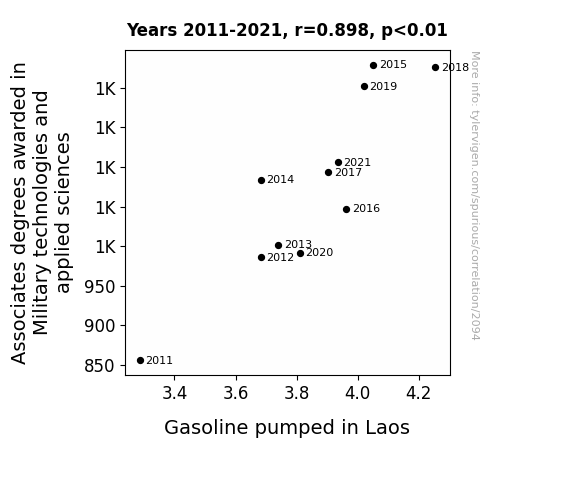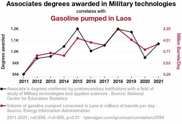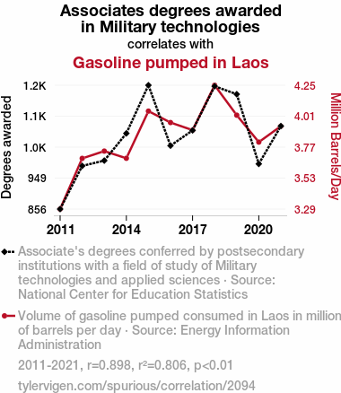 - The spurious research paper: Fueling the Future: Exploring the Correlation between Associates Degrees in Military Technologies and Applied Sciences and Gasoline Consumption in Laos