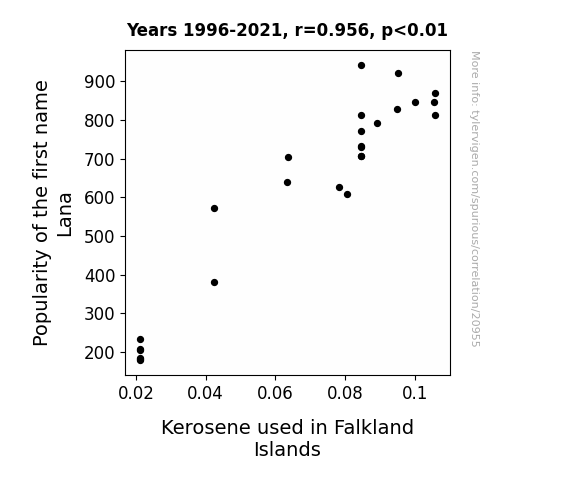 This means 91.3% of the change in the one variable (i.e., Kerosene used in Falkland Islands) is predictable based on the change in the other (i.e., Popularity of the first name Lana) over the 26 years from 1996 through 2021.