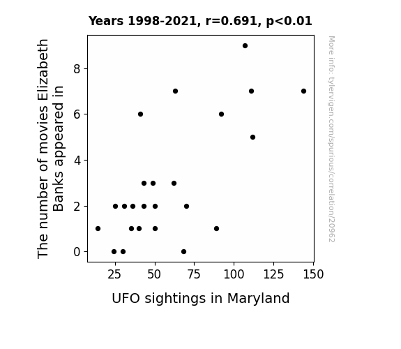 This means 47.7% of the change in the one variable (i.e., UFO sightings in Maryland) is predictable based on the change in the other (i.e., The number of movies Elizabeth Banks appeared in) over the 24 years from 1998 through 2021.