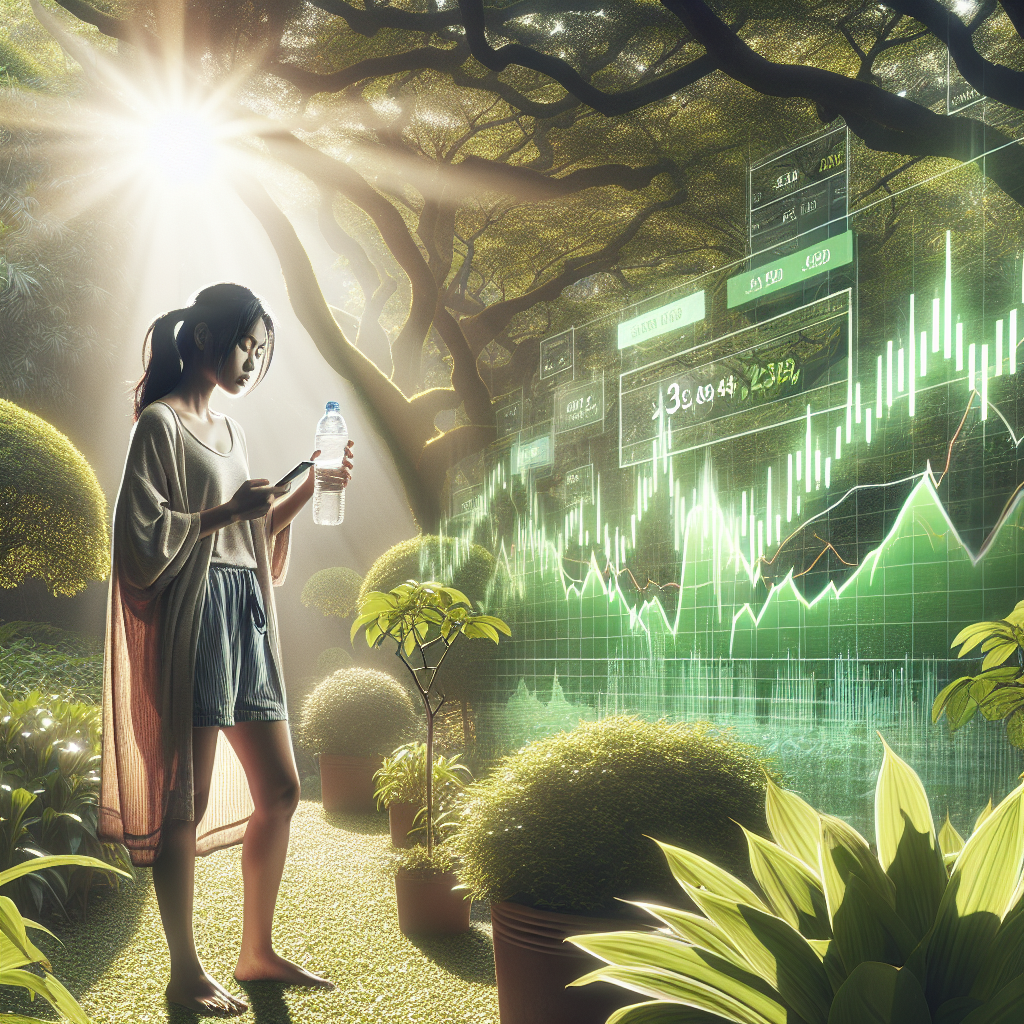 ChatGPT: Generate an image showing a person standing in a lush garden, holding a bottle of water in one hand and checking their phone with the other. The person is wearing casual clothes. Show the screen of the phone displaying the stock chart of PACCAR with an upward trend. The scene should be filled with bright, natural sunlight to create a warm and serene atmosphere. The focus should be on the person and the phone, with the greenery in the background providing a refreshing outdoor ambiance. The image should have a calming and grounded feeling, reflective of a simple moment of relaxation and monitoring of personal finance.