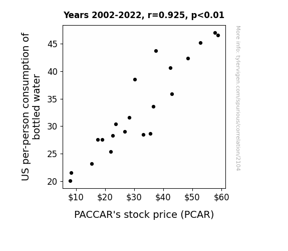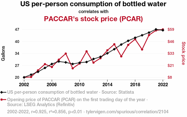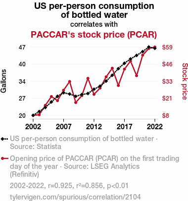 - The spurious research paper: The Ripple Effect: Investigating the Quirky Relationship Between US Bottled Water Consumption and PACCAR Stock Price