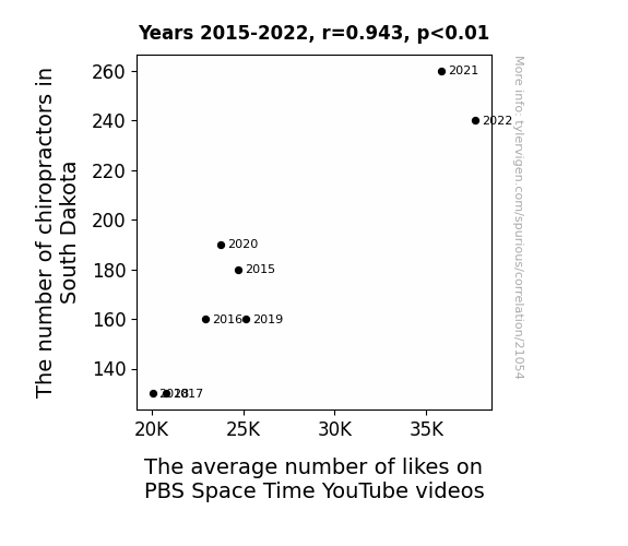 This means 89% of the change in the one variable (i.e., The average number of likes on PBS Space Time YouTube videos) is predictable based on the change in the other (i.e., The number of chiropractors in South Dakota) over the 8 years from 2015 through 2022.