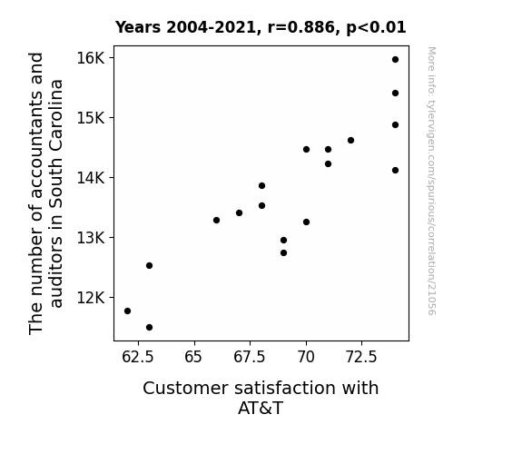 This means 78.5% of the change in the one variable (i.e., Customer satisfaction with AT&T) is predictable based on the change in the other (i.e., The number of accountants and auditors in South Carolina) over the 18 years from 2004 through 2021.