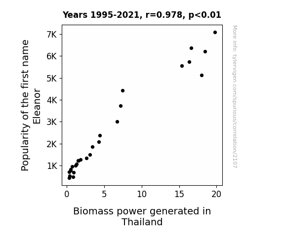 This means 95.7% of the change in the one variable (i.e., Biomass power generated in Thailand) is predictable based on the change in the other (i.e., Popularity of the first name Eleanor) over the 27 years from 1995 through 2021.