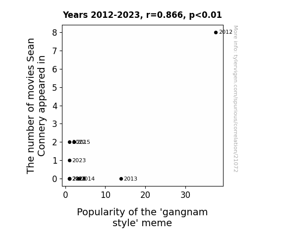 This means 74.9% of the change in the one variable (i.e., Popularity of the 'gangnam style' meme) is predictable based on the change in the other (i.e., The number of movies Sean Connery appeared in) over the 12 years from 2012 through 2023.